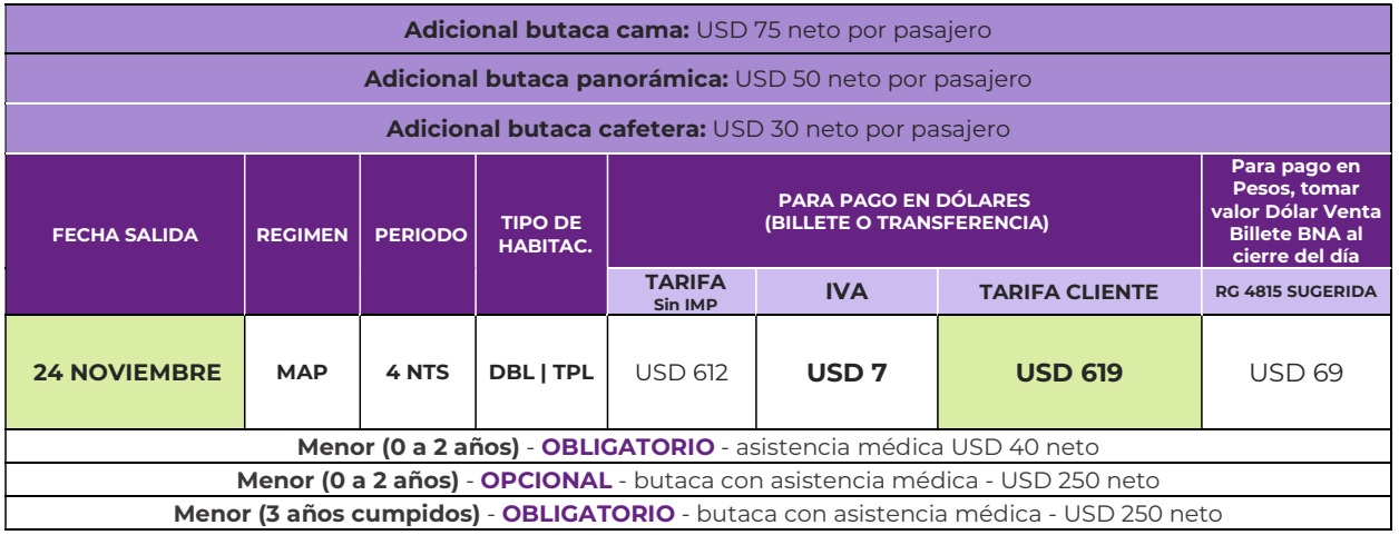 Tarifas en dólares USD por persona, en base según corresponda (Base DBL – TPL). IVA discriminado y detallado.