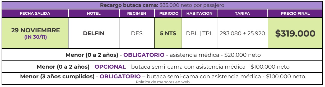 Tarifas en pesos ARS por persona, en base según corresponda (Base DBL – TPL). IVA discriminado y detallado.