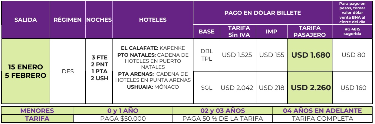 Tarifas en dólares USD por persona, en base según corresponda (Base SGL – DBL – TPL). IVA discriminado y detallado.